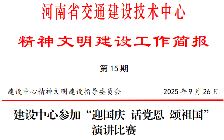 9月26日上午,河南省交通建设技术中心参加了正光街社区举办的“迎国庆 话党恩 颂祖国”演讲比赛。中心职工张振华以《以高质量交通强省助力河南现代化》为题进行演讲,获得三等奖。